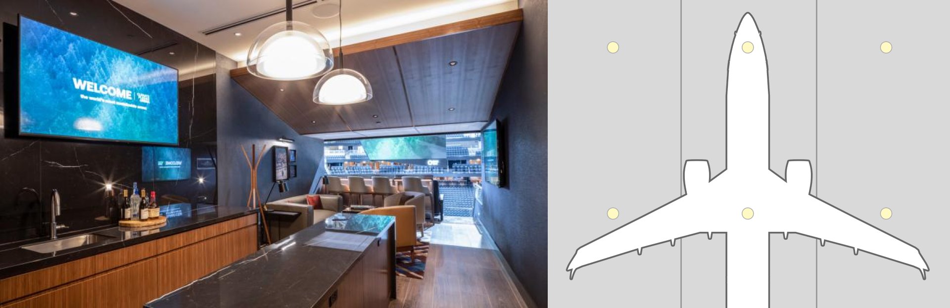 Inside a suite in the Climate Pledge Arena, a 16-square-foot area of the ceiling will display the airplane.
