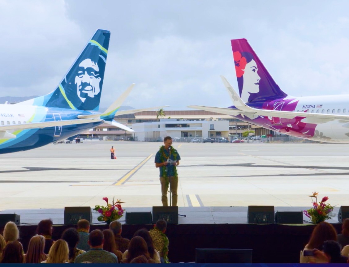 As a bonus, word spread of this achievement, and my 3D airplanes were used for other projects. Presentations and web product designs repurposed the imagery. Also, when Hawaiian Airlines joined the Alaska Airlines family, a dual-company event needed to feature both brands' aircraft. My plane was used for 3D previsualization to stage real aircraft tail-to-tail for the live broadcast.