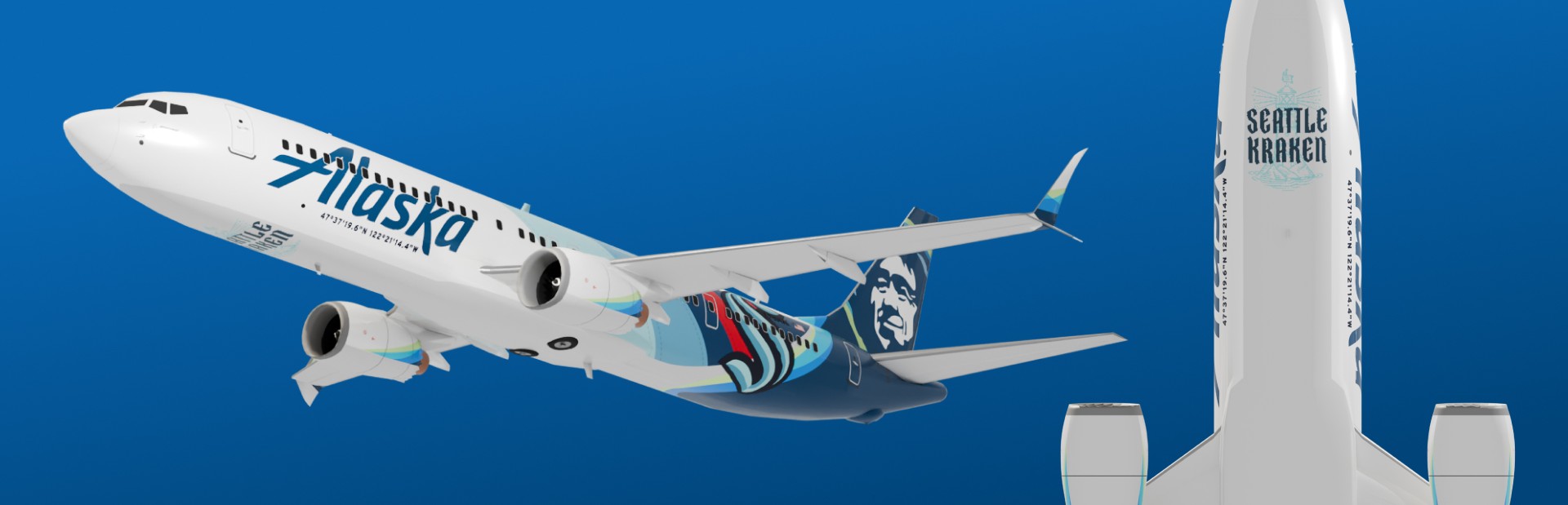 The Alaska Airlines plane with new Kraken livery will appear in a takeoff pose.