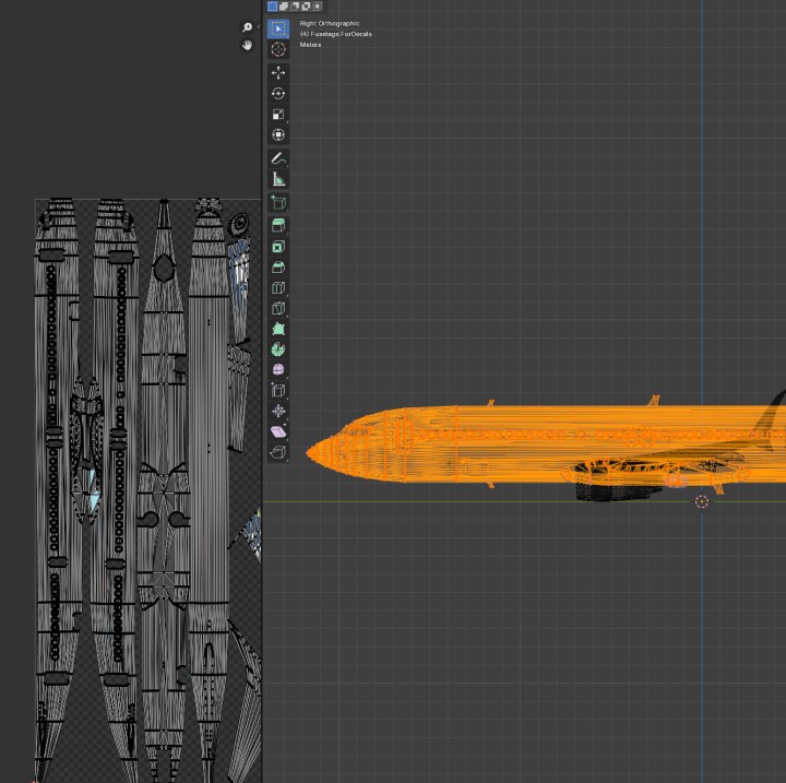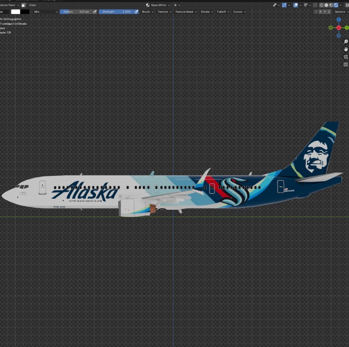 With the topology tackled, the fun could begin! The first step was preparing the 3D model for the 2D livery design. I split the model into grouped sections that made the most sense for applying flat graphics. The port side fuselage and vertical stabilizer could receive nearly all of the livery. Then the port side wings and engines. These can be mirrored to achieve symmetry.